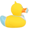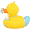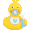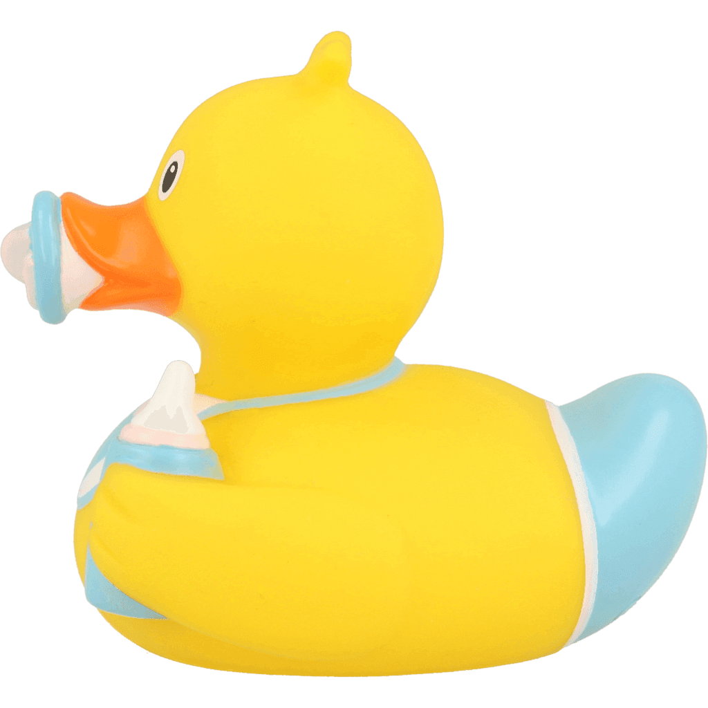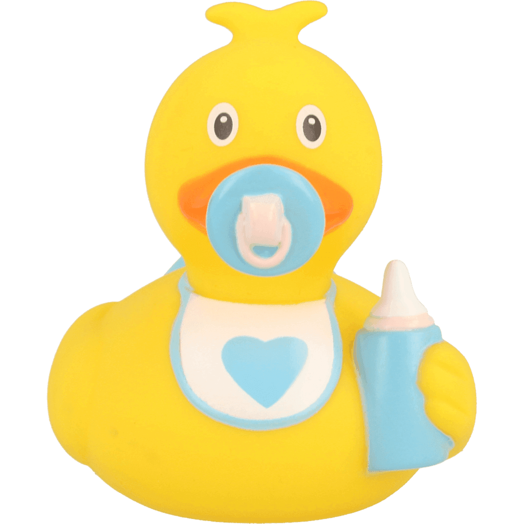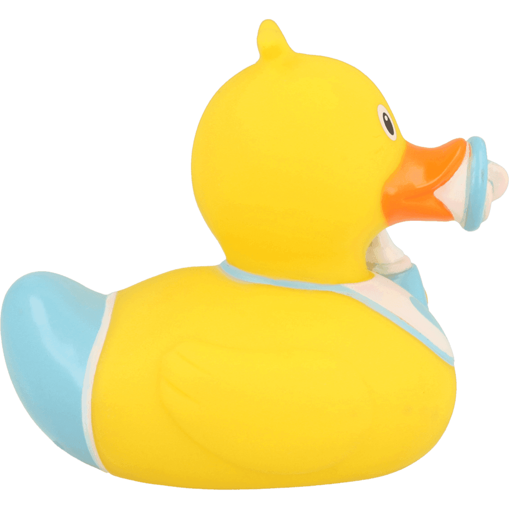 En søt og sjarmerende guttebaby-badeand som har på seg bleie og holder en tåteflaske i hånden, med smokk i munnen og siklesmekke rundt halsen. Han er den perfekte følgesvennen for enhver liten gutt i badekaret og vil også være en flott gave til en nybakt mamma eller pappa.