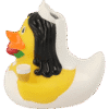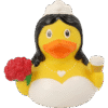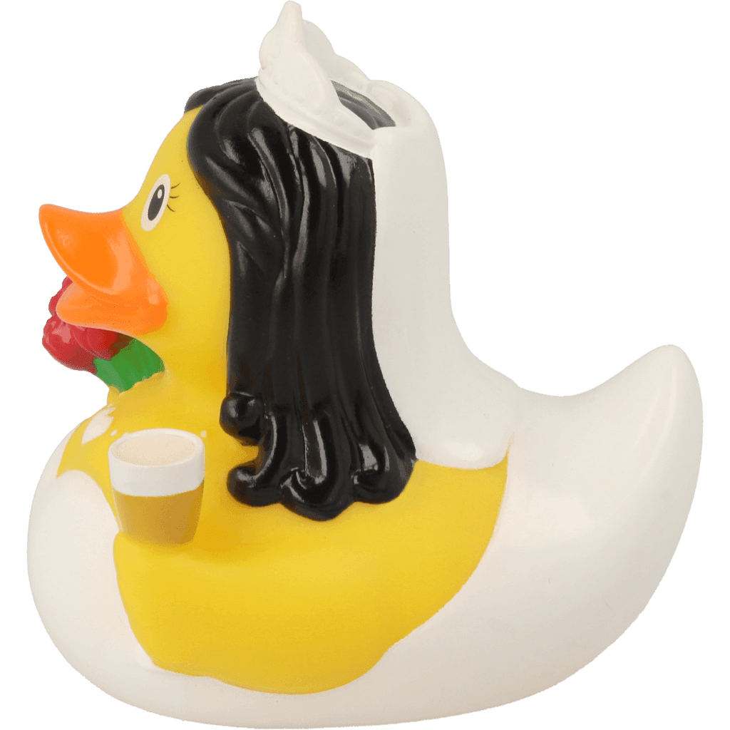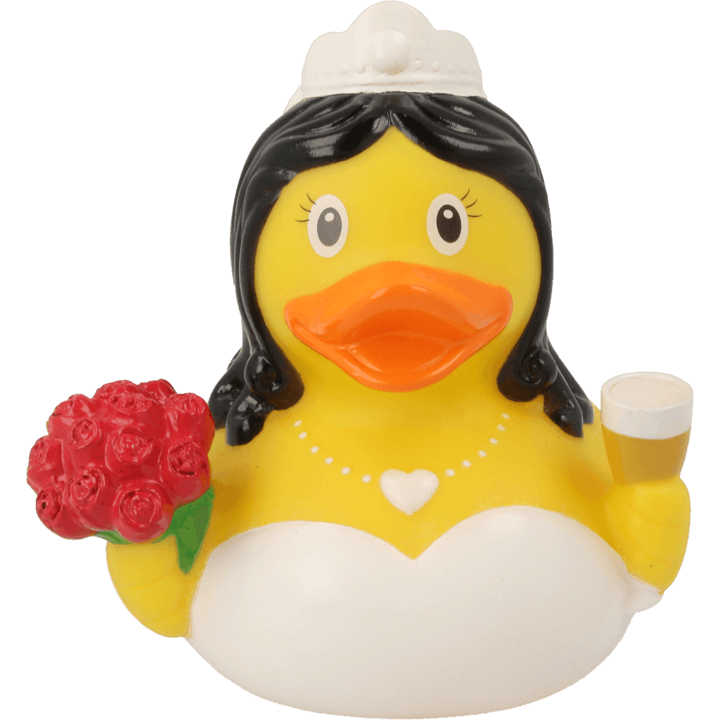 Badeand-bruden er den perfekte badeanden for den kommende bruden og deltakerne i hennes hønefest eller utdrikningslag! I en nydelig hvit kjole og slør og champagneglass i hånden, er denne badeand-bruden klar til å feire med stil. Med en stor bukett blomster i hånden og et hjerte i kjede rundt halsen, er hun klar for å gå ned midtgangen og si «ja» til sin brudgom. En morsom og unik gave til enhver brud eller som en morsom dekorasjon for en hønefest eller bryllup.