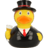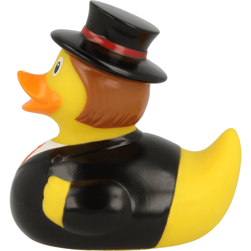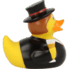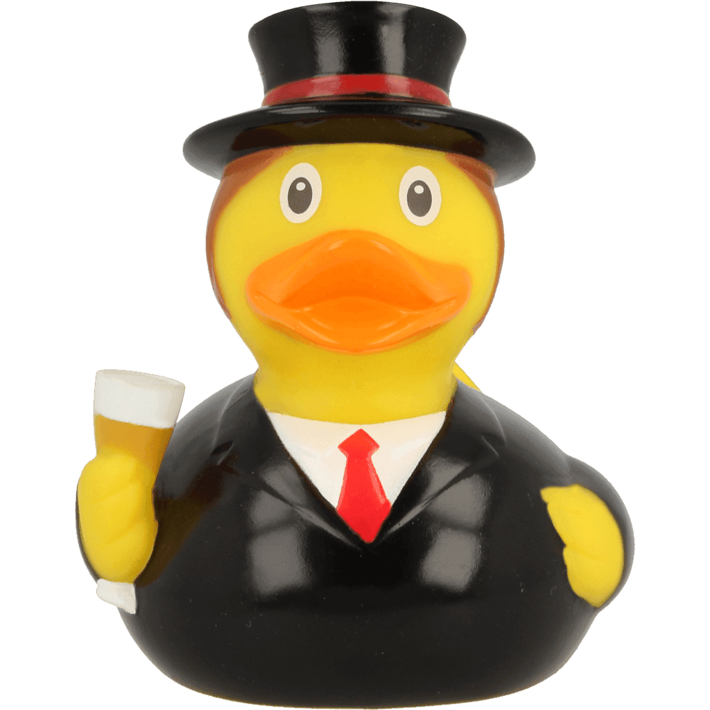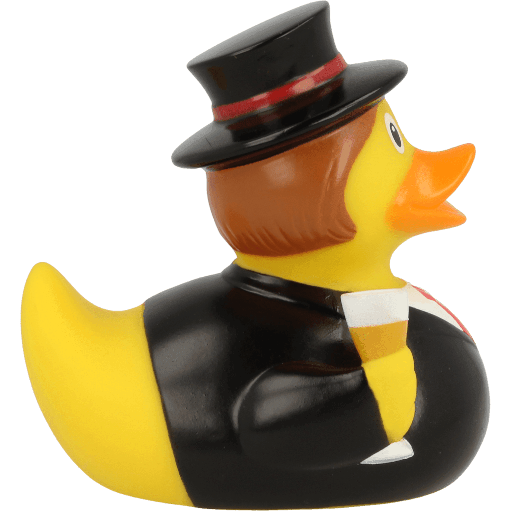 Badeand-brudgommen er kledd i en stilig svart dress og en elegant flosshatt med rødt bånd og matchende rødt slips. Med et champagneglass i hånden og et stort smil i andsiktet er han klar til å feire den store dagen med sin elskede badeand-brud. Badeand-brudgommen er en morsom gave til en kommende brudgom, og en perfekt tilføyelse til enhver badeand-samling.