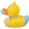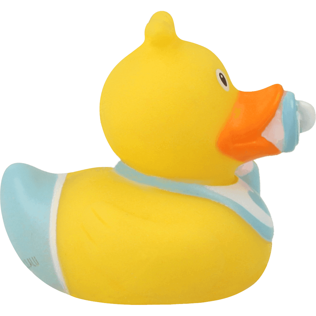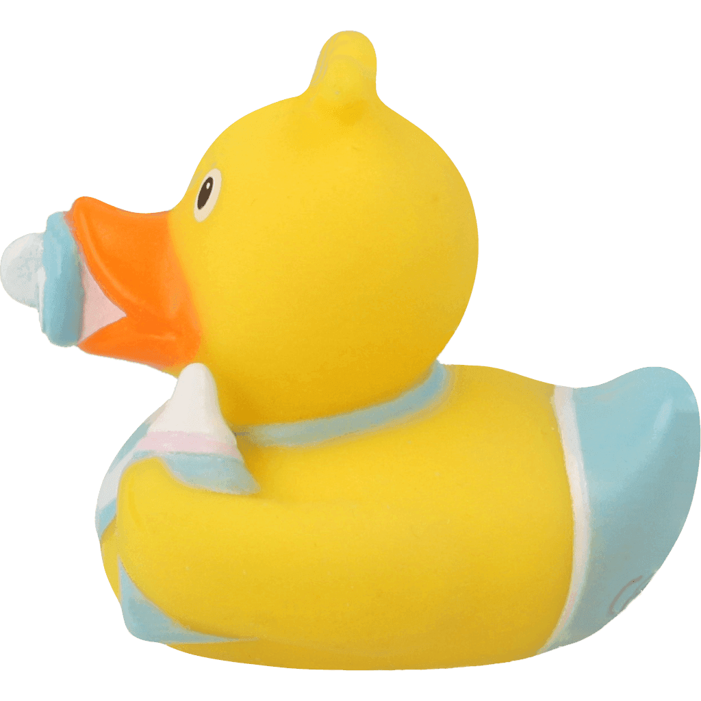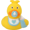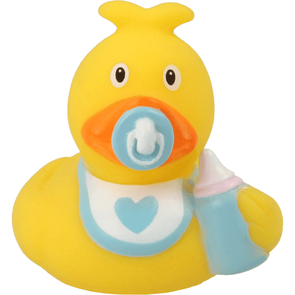 En søt og sjarmerende guttebaby-badeand som har på seg bleie og holder en tåteflaske i hånden, med smokk i munnen og siklesmekke rundt halsen. Han er den perfekte følgesvennen for enhver liten gutt i badekaret og vil også være en flott gave til en nybakt mamma eller pappa.