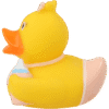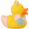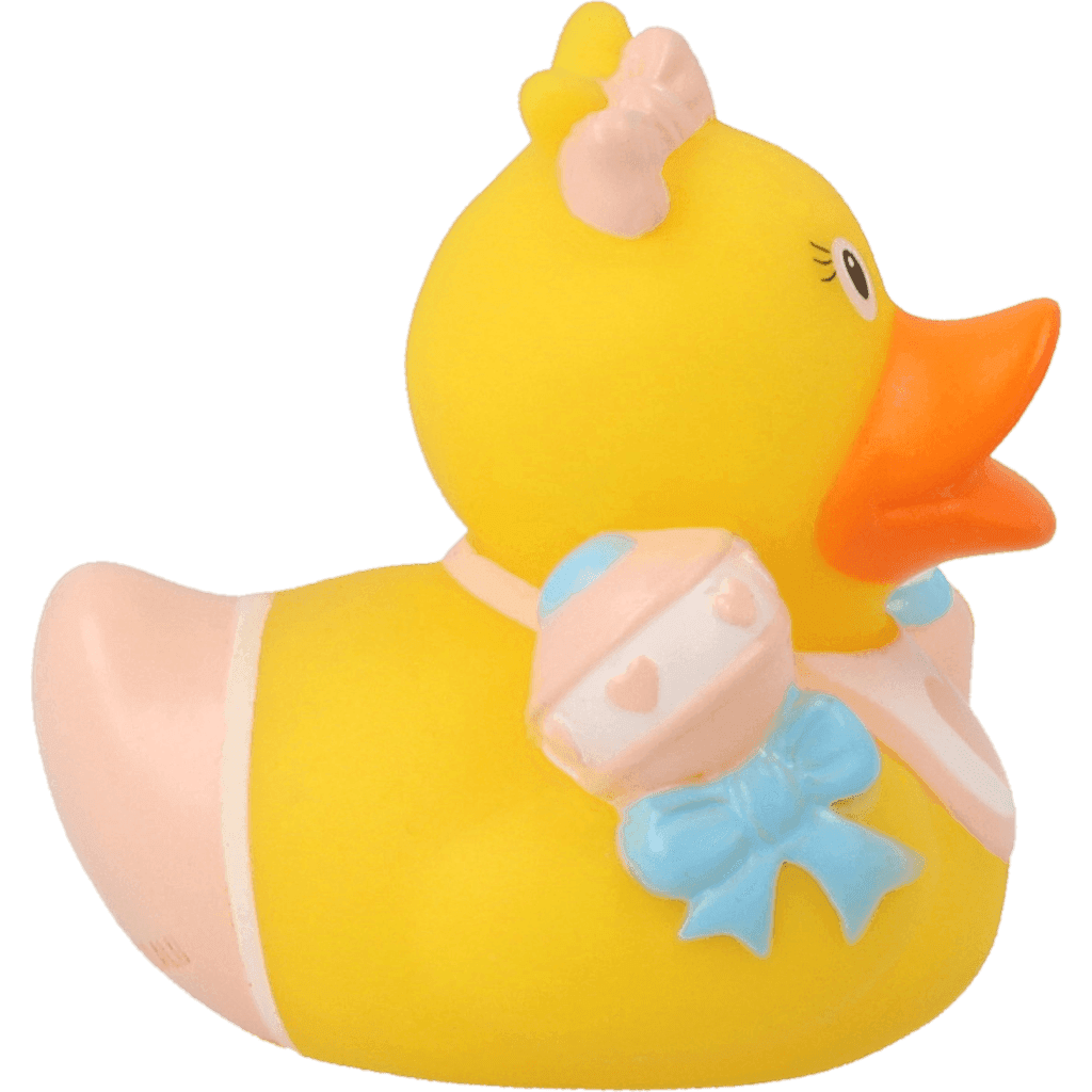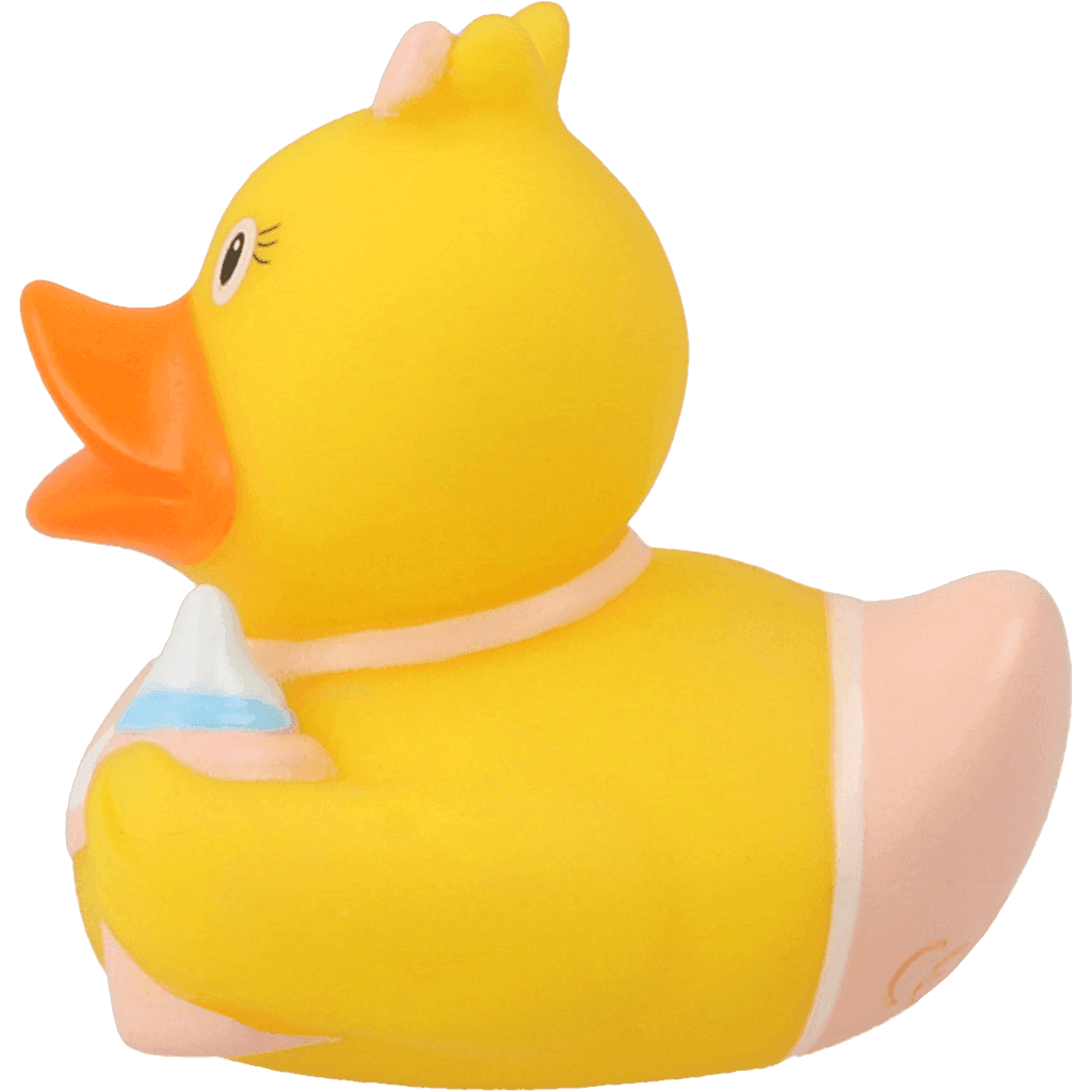 En søt og uimotståelig jentebaby-badeand kledd i rosa og med en matchende sløyfe i håret. Siklesmekken er på plass, og hun har en rangle og en tåteflaske i hendene. En perfekt gave til de nybakte foreldrene eller til en babyshower!